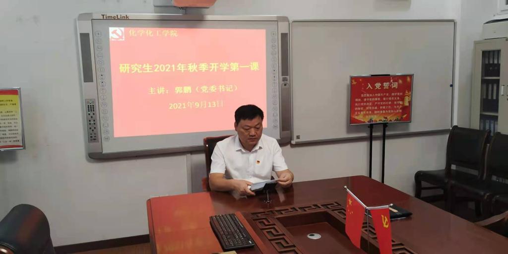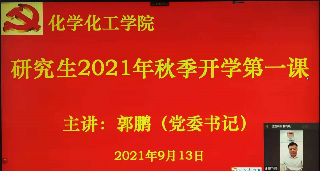 为贯彻落实省委和省教育厅疫情防控有关要求,持续深入开展抗灾防疫思政教育,激励员工们勇担时代使命、坚定报国之志,推进党史学习教育走深、走实,9月13日,化学化工公司党委书记郭鹏通过网络腾讯视频为公司全体研究生认真讲授2021秋季“开学第一课”。研究生秘书马献涛博士主持“第一课”活动。