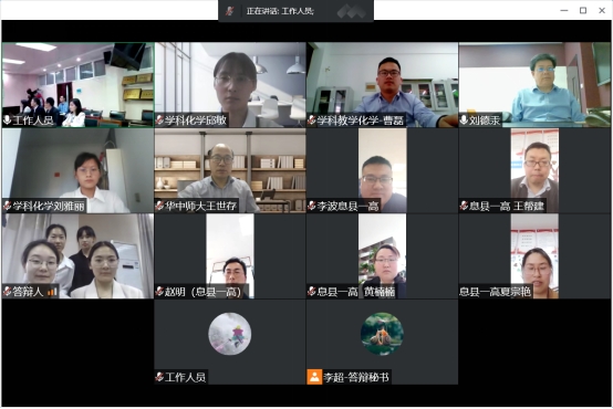 本次硕士研究生学位论文答辩会分3个小组进行,第一组包含学科教学(化学)专业硕士研究生7人,第二组包含无机化学、物理化学及有机化学方向硕士研究生8人,第三组为分析化学方向硕士研究生6人。第一组邀请息县一高中学正高级教师赵明主任担任答辩主席,华中师范大学王世存副教授,刘德汞郭鹏王玲玲王红军、朱建君等校内导师担任答辩委员。第二组邀请了河南大学牛景杨教授担任答辩主席,井强山、刘鹏、樊阳曹新华、饶伟浩、唐林、姜勇等校内导师担任答辩委员;第三组邀请了郑州大学屈凌波教授担任答辩主席,黄淮公司刘彦明教授,曹俊涛甘甜许婧、何梦媛等校内外导师担任答辩委员。
