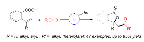 近日,公司饶伟浩博士课题组在有机化学领域知名期刊《The Journal of Organic Chemistry》上发表了题为Photoredox-Catalyzed Acyl Lactonization of Alkenes with Aldehydes: Synthesis of Acyl Lactones(DOI:10.1021/acs.joc.2c01732)的研究成果。该研究通过发展廉价易得的醛作为酰基化试剂,利用氢原子转移策略与可见光氧化还原催化策略的巧妙结合,发展了酰基内酯的绿色温和、高效构建新方法。通过自由基捕捉实验、荧光淬灭、光开/关和光量子产率实验等机理研究,揭示了该反应很可能经历了自由基链过程。