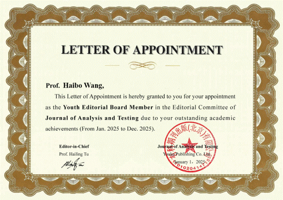 近日,《Journal of Analysis and Testing》期刊公布了2025年新增青年编委会成员名单。公司betway西汉姆联平台王海波教授受邀担任该期刊青年编委。