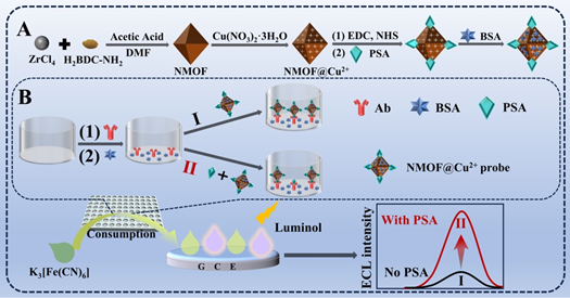 基于此,该课题组在前期共反应剂调控策略(ACS Appl. Mater. Interfaces, 2023, 15, 22959-22966; Biosens. Bioelectron., 2021, 171: 112729.)和劈裂式免疫分析方法(ACS Appl. Nano Mater., 2023, 6, 6496-6503;ACS Sens.,2025, 10, 196-203)研究的基础上,设计合成了铜离子掺杂的氨基-金属有机框架化合物(NMOF@Cu2+)作为共反应剂调控单元,利用其与共反应剂铁氰化钾(K3[Fe(CN)6])的反应,构建了灵敏检测PSA的竞争型ECL免疫传感器。在检测过程中,表面负载羧基的NMOF@Cu2+纳米探针与PSA偶联形成PSA-NMOF@Cu2+复合物。此外,NMOF@Cu2+纳米探针还可与ECL共反应剂K3[Fe(CN)6]发生反应生成铜铁普鲁士蓝(NMOF@CuFe-PBA)复合物。在免疫反应过程中,当PSA存在时,PSA将与PSA-NMOF@Cu2+复合物竞争抗体结合位点,造成复合物的固定量降低,从而减少共反应剂K3[Fe(CN)6]的消耗,使鲁米诺-K3[Fe(CN)6]体系的ECL信号升高,实现PSA的灵敏检测,检测原理示意图如下:
