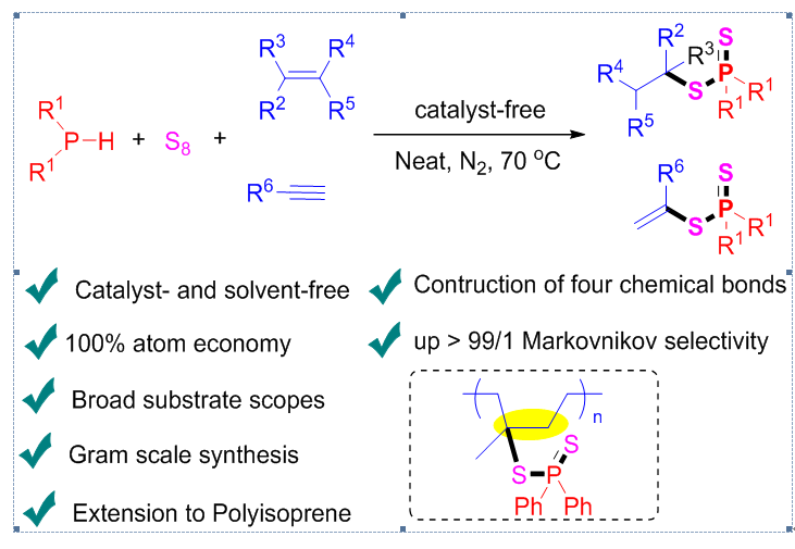 近日,公司马献涛副教授课题组在绿色化学领域权威期刊《Green Chemistry》上发表了题为“Catalyst- and solvent-free, atom and step economic synthesis of dithiophosphinates by one-pot domino introduction of sulfur atoms strategy”(DOI: 10.1039/D5GC00821B)的研究论文。该工作发展了一种无催化剂、无溶剂条件下的多米诺多组分反应新策略,实现了二苯基膦、单质硫(S₈)与烯烃/炔烃的高效绿色转化,提供了一种原子和步骤经济性合成烷基二硫代膦化物的新方法。