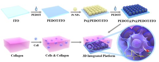 基于此,该课题组在前期研究的基础上(Analytical Chemistry, 2021, 93, 7917−7924; Microchimica Acta, 2022, 189, 89; Microchemical Journal, 2024, 204, 111061),制备了基于高催化性能Pt纳米颗粒和抗污染性能聚-3,4-乙烯二氧噻吩(PEDOT)的夹心型电化学传感器,并与胶原水凝胶三维培养基质集成,制备了三维培养与检测一体化平台,实现了细胞活性氧释放的实时监测,具体制备及检测示意图如下: