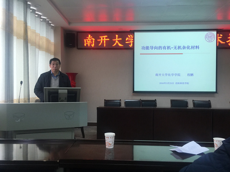 3月25日下午,南开大学化学公司程鹏教授应邀在betway西汉姆联平台学术报告厅作了题为“功能导向的有机-无机杂化材料”的学术报告。信阳师范公司副经理刘彦明出席并主持了报告会。参加报告会的还有化院经理杨性坤教授、副经理井强山教授以及公司的青年教师和全体研究生。