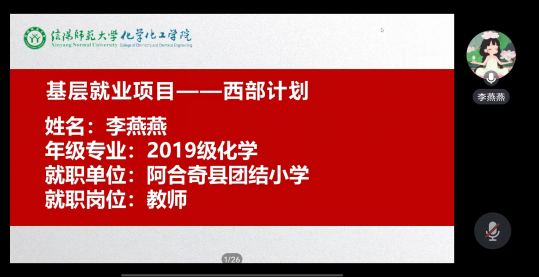 会上,李燕燕首先讲述自己为何选择西部计划,然后分享了自己如何成功入选和目前的岗位情况,最后对西部计划的政策进行解读,并结合自身的成长,呼吁同学们参与到祖国建设支援西部发展。随后,房祥鹏对西部计划再次进行了详细介绍,然后结合工作事例,分享了自己在新疆的所见所闻,把成长中的经验传授于同学们,并与同学亲切交流,详细回答同学们的问题,鼓励同学们,将个人理想信念同党和国家的事业相融合。会上,两位员工对同学们的提问进行一一解答。