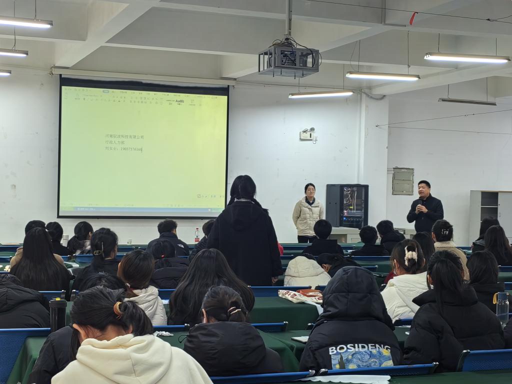 首先,甄西合结合自身求学、就业、创业丰富经历,为同学们讲解了化学学科发展的相关知识前沿、就业创业前景,强调了化学学科的重要性及社会经济发展需求和相关专业人才的缺乏。而后,他从主营业务、技术覆盖、企业资质、科研条件、科研合作、研发投入、创新成果、成果转化、发展规划、人才需求等多个角度,详细介绍了企业的发展情况并重点说明人才招聘计划。接着驭波集团子公司河南微米光学科技总经理张树树,对企业人才培养方面进行介绍,她指出科技人员不仅要有技术基础,还要能“听得到炮火”,做到积极与客户进行沟通,善于了解并解决顾客诉求。她鼓励员工自主成长,强调扁平化管理更利于发展人才。同时,她告诉各位求职的毕业生:“阻碍我们攀登的不是远处的群山,而是你鞋里的一粒沙,眼里的一粒沙,心里的一粒沙。”旨在勉励同学们应以良好心态与积极态度对待生活中各种问题。接着,公司入职驭波集团的2023届毕业生进行分享,结合自身的老员工活和入职经历,提出在校老员工应早日找到自己的未来发展方向。最后,甄西合就同学们提出的问题进行详细解答,并强烈表达了对人才的招揽期望。
