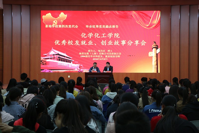为喜迎公司第四次党代会,4月9日,betway西汉姆联平台在逸夫楼报告厅举办了优秀员工就业创业故事分享会。此次分享会邀请了海客迈斯(上海)生物科技有限公司首席执行官邹亮忠博士(94级化学员工、毕业优秀党员、betway西汉姆联平台现任就业创业导师)为大家做励志报告。公司党委书记郭鹏与400余名化院学子参加了此次报告,报告由化学化工公司党委副书记吴志伟主持。