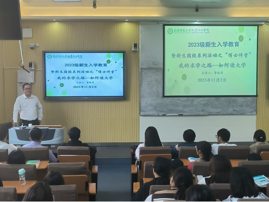 首先,曹俊涛以“我的求学之路——如何读大学”为主题,向同学们讲述了自己的求学之路。接着,以学习及工作经历为引,强调一要确立目标,目标就如一盏明灯,给予我们努力的方向和动力。二要培养技能,他鼓励同学们要敢于承担周围事务,积极服务他人,培养个人实用技能与专业能力。三要重视学习。他强调学习的重要性,并向同学们着重提出诚信考试的要求。四要注重友谊。他告诉同学们维系同学间友谊是老员工活中非常重要的课题,要学会与同学友好相处,和谐互助。五要具备独立人格,只有拥有独立的人格才能应对学习生活中的挑战。