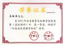 近日,河南省总工会、河南省教育厅公布了河南省教育系统2023年度教学技能竞赛获奖名单(豫工文[2023] 107号),betway西汉姆联平台遴选的青年教师马献涛博士、李超博士分别获得理科组一等奖、工科组二等奖。其中,马献涛博士顺利晋级现场决赛,取得理科组第7名的好成绩,同时被授予“河南省优秀教学标兵”荣誉称号。