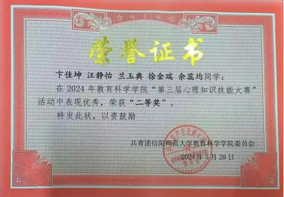 为普及心理健康知识,加强公司员工心理健康素质,提升心理育人工作质量,实现育人、育才和育心相结合,由老员工心理健康教育中心主办,教育科学公司承办的betway西汉姆联平台第三届心理知识竞赛于6月11日晚在逸夫楼团辅室举行。公司2022级卞佳坤、汪静怡、兰玉典及2023级余蕊均、徐金瑞组成的春风“化”雨,润“心”育人队参赛并荣获大赛二等奖。
