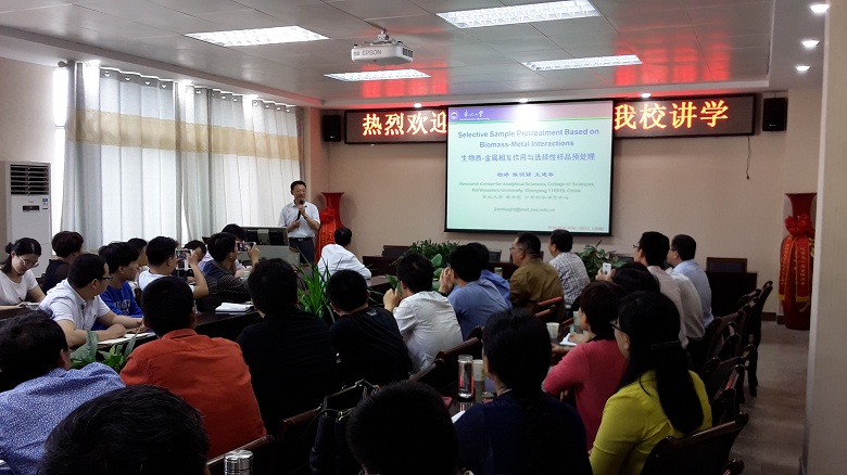 在“生物质-金属相互作用与选择性样品预处理”报告会上,王建华教授以原子光谱分析与生命科学为切入点,从金属硫蛋白用于镉的选择性吸附分离、细胞表面基因工程调控:选择性吸附镉、噬菌体文库筛选Cr(III):选择性吸附Cr(III)三个方面介绍了其课题组近年来的研究成果。作为TALANTA杂志副主编,王教授从副主编角度上做了题为“TALANTA撰稿与编辑相关问题讨论”的报告,王教授对TALANTA杂志近年来的发展、稿件筛选标准、稿件审理过程中常见的问题进行了详细介绍。王教授的讲座深入浅出、图文并茂、精彩纷呈,引来了师生们的阵阵掌声。在互动环节,王建华教授详细地回答了大家的问题。