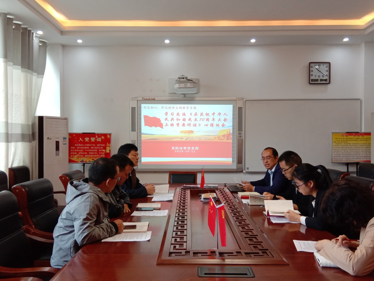 无机化学支部党员畅谈交流了学习《习近平新时代中国特色社会主义思想学些纲要》《习近平关于“不忘初心、牢记使命”论述摘编》的心得体会。支部党员同志深刻认识到主题教育对于思想建党、理论强党的重要意义,纷纷表示要高质量完成主题教育的各项任务。