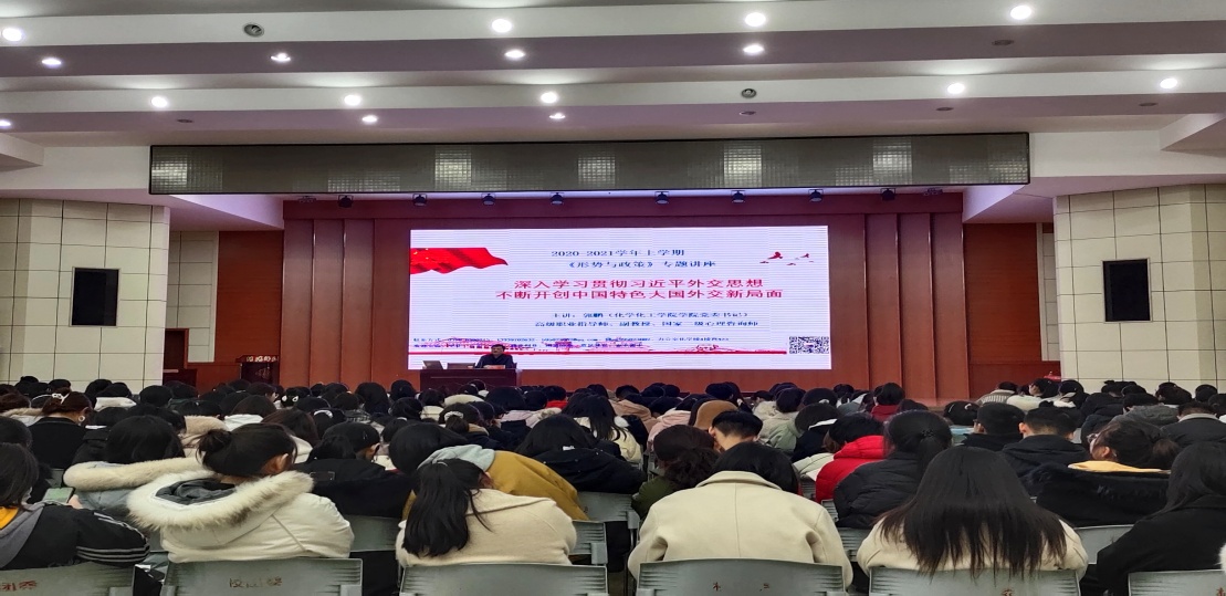 1128日,化学化工公司党委书记郭鹏在逸夫楼报告厅为员工党员、团学干部、各班团负责人、2020级全体作“深入学习习近平外交思想”专题《形势与政策》讲座。